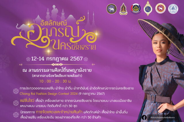 ขอเชิญร่วมงาน อัตลักษณ์อาภรณ์นครเชียงราย ในวันที่ 12-14 กรกฎาคม 2567 นี้ ตั้งแต่เวลา 10.00-20.30 น. ณ ลานธรรมลานศิลป์ถิ่นพญามังราย (ศาลากลางจังหวัดเชียงรายหลังเก่า) พบกับ การแสดงแฟชั่นโชว์สุดอลังการ โดยนายแบบนางแบบมืออาชีพ การจัดแสดงและจำหน่ายสินค้า ผลิตภัณฑ์ผ้า เสื้อผ้าไทย ผ้าพื้นถิ่น ผ้าแฟชั่น เครื่องประดับ และของที่ระลึกมากมาย