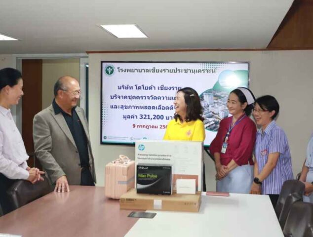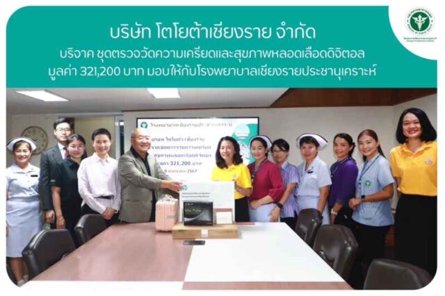 เมื่อวันอังคารที่ 9 กรกฎาคม 2567 เวลา 09.30 น. แพทย์หญิงอัจฉรา ละอองนวลพานิช ผู้อำนวยการ พร้อมผู้บริหาร และทีมเจ้าหน้าที่โรงพยาบาลเชียงรายประชานุเคราะห์ รับมอบบริจาค ชุดตรวจวัดความเครียดและสุขภาพหลอดเลือดดิจิตอล มูลค่า 321,200 บาท บริจาคโดย บริษัท โตโยต้าเชียงราย จำกัด ณ ห้องประชุมสำนักงานอำนวยการ