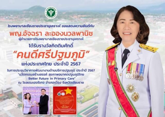 ขอแสดงความยินดีกับ แพทย์หญิงอัจฉรา ละอองนวลพานิช ผู้อำนวยการโรงพยาบาลเชียงรายประชานุเคราะห์ ที่ได้รับรางวัลกิตติมศักดิ์ “คนดีศรีปฐมภูมิ แห่งประเทศไทย ประจำปี 2567” ในการประชุมวิชาการพัฒนางานด้านบริการปฐมภูมิ ประจำปี 2567 “นวัตกรรมสร้างสรรค์ สุขภาพอนาคตปฐมภูมิไทย : Better Future in Primary Care” ณ โรงแรมเฮอริเทจ อำเภอเมือง จังหวัดเชียงราย