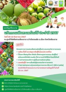 ประชาสัมพันธ์ เชิญชวนขอเชิญเที่ยวงาน นวัตกรรมพืชสวนพร้อมใช้ วันที่ 20-22 สิงหาคม 2567 ณ ศูนย์วิจัยพืชสวนเชียงราย ตำบลป่าอ้อดอนชัย อำเภอเมือง จังหวัดเชียงราย