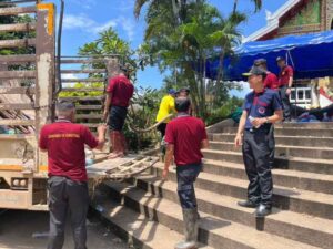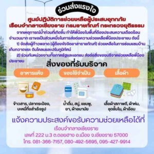 เวลา 11.20 น. นายพัศพงศ์ ใจคล่องแคล่ว ผู้บัญชาการเรือนจำกลางเชียงราย พร้อมเจ้าหน้าที่เรือนจำนำผู้ต้องขังจิตอาสาราชทัณฑ์ จำนวน 5 คน ช่วยยกสิ่งของบริจาคช่วยเหลือผู้ประสบอุทกภัย ณ วัดโป่งนาคำ ตำบลดอยฮาง อำเภอเมืองเชียงราย