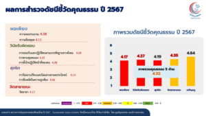 โดยสถานการณ์คุณธรรมปี 2567 รศ.นพ.สุริยเดว ทรีปาตี ผู้อำนวยการศูนย์คุณธรรม เผยว่า “ปัจจุบันได้มีการสำรวจสถานการณ์คุณธรรมของสังคมไทย ประจำปี 2567 ด้วย 2 เครื่องมือ คือดัชนีชี้วัดคุณธรรมและทุนชีวิต ในกลุ่มคนไทย 3 ช่วงวัย คือ อายุ 13-24 ปี อายุ 25-40 ปี และ อายุ 41 ปีขึ้นไป รวม 29,432 คน ใน 6 ภูมิภาค คือ ภาคเหนือ ภาคตะวันออกเฉียงเหนือ ภาคกลาง ภาคตะวันออก ภาคตะวันตก และภาคใต้ พบผลสำรวจที่น่าสนใจคือ ดัชนีชี้วัดคุณธรรมภาพรวม 3 ช่วงวัยอยู่ในระดับพอใช้ อยู่ที่ค่าเฉลี่ย 4.32 จากคะแนนเต็ม 6 คะแนน เปรียบเทียบกับปี 2566 ที่อยู่ในระดับพอใช้ ค่าเฉลี่ย 4.73 ลดลง 8.67% และคุณธรรม 5 ด้าน ภาพรวม 3 ช่วงวัย พบว่า คุณธรรมด้านพอเพียง วินัยรับผิดชอบ และสุจริต อยู่ในระดับน้อย ค่าเฉลี่ย 4,17, 4.27 และ 4.19 ตามลำดับ ส่วนคุณธรรมด้านกตัญญู และจิตสาธารณะ อยู่ในระดับพอใช้ ค่าเฉลี่ย 4.64 และ 4.35 และเป็นที่น่าสังเกตว่าคุณธรรมด้านสุจริต อยู่ในระดับน้อยทั้ง 3 ช่วงวัย คือ อายุ 13-24 ปี ค่าเฉลี่ย 4.21 อายุ 25-40 ปี ค่าเฉลี่ย 4.04 และอายุ 41 ปีขึ้นไป ค่าเฉลี่ย 4.31