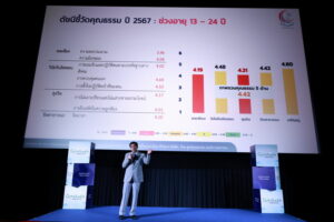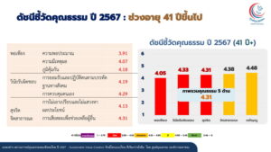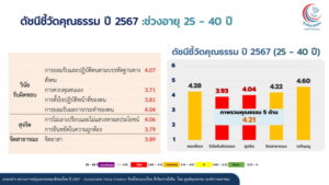 โดยสถานการณ์คุณธรรมปี 2567 รศ.นพ.สุริยเดว ทรีปาตี ผู้อำนวยการศูนย์คุณธรรม เผยว่า “ปัจจุบันได้มีการสำรวจสถานการณ์คุณธรรมของสังคมไทย ประจำปี 2567 ด้วย 2 เครื่องมือ คือดัชนีชี้วัดคุณธรรมและทุนชีวิต ในกลุ่มคนไทย 3 ช่วงวัย คือ อายุ 13-24 ปี อายุ 25-40 ปี และ อายุ 41 ปีขึ้นไป รวม 29,432 คน ใน 6 ภูมิภาค คือ ภาคเหนือ ภาคตะวันออกเฉียงเหนือ ภาคกลาง ภาคตะวันออก ภาคตะวันตก และภาคใต้ พบผลสำรวจที่น่าสนใจคือ ดัชนีชี้วัดคุณธรรมภาพรวม 3 ช่วงวัยอยู่ในระดับพอใช้ อยู่ที่ค่าเฉลี่ย 4.32 จากคะแนนเต็ม 6 คะแนน เปรียบเทียบกับปี 2566 ที่อยู่ในระดับพอใช้ ค่าเฉลี่ย 4.73 ลดลง 8.67% และคุณธรรม 5 ด้าน ภาพรวม 3 ช่วงวัย พบว่า คุณธรรมด้านพอเพียง วินัยรับผิดชอบ และสุจริต อยู่ในระดับน้อย ค่าเฉลี่ย 4,17, 4.27 และ 4.19 ตามลำดับ ส่วนคุณธรรมด้านกตัญญู และจิตสาธารณะ อยู่ในระดับพอใช้ ค่าเฉลี่ย 4.64 และ 4.35 และเป็นที่น่าสังเกตว่าคุณธรรมด้านสุจริต อยู่ในระดับน้อยทั้ง 3 ช่วงวัย คือ อายุ 13-24 ปี ค่าเฉลี่ย 4.21 อายุ 25-40 ปี ค่าเฉลี่ย 4.04 และอายุ 41 ปีขึ้นไป ค่าเฉลี่ย 4.31