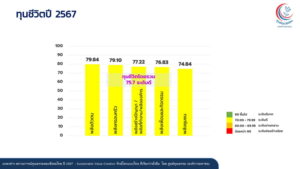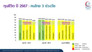 ในขณะที่ผลสำรวจทุนชีวิตภาพรวม ปี 2567 ใน 3 ช่วงวัย พบว่า อยู่ในระดับดี ร้อยละ 77.57 เปรียบเทียบปี 2566 ที่อยู่ในระดับดีมาก ร้อยละ 83.80 ลดลง 7.43% และผลสำรวจทุนชีวิตรายพลัง ซึ่งเป็นระบบนิเวศรอบตัวมนุษย์ที่เป็นรากฐานของการดำรงชีวิตและเป็นปัจจัยสำคัญในการรับมือและแก้ไขปัญหา ประกอบไปด้วย 5 พลัง คือ พลังตัวตน พลังครอบครัว พลังสร้างปัญญา/พลังที่ทำงานหรือพลังองค์กร พลังเพื่อนและกิจกรรม และพลังชุมชน พบว่า ในกลุ่มอายุ 13-24 ปี พลังตัวตนอยู่ในระดับดีมาก ร้อยละ 80.15 ขณะที่ อายุ 25-40 ปี พลังตัวตน และพลังครอบครัว อยู่ในระดับดีมาก คือ ร้อยละ 81.13 และร้อยละ 80.70 ส่วน อายุ 41 ปี ขึ้นไป ทั้ง 5 พลัง อยู่ในระดับดี พลังตัวตน ร้อยละ 78.24 พลังครอบครัว ร้อยละ 77.94 พลังที่ทำงานหรือพลังองค์กร ร้อยละ 76.21 พลังเพื่อนและกิจกรรม ร้อยละ 75.58 และพลังชุมชน ร้อยละ 74.66 ซึ่งเป็นที่น่าสังเกตว่า ผลสำรวจทุนชีวิตรายข้อ ใน 3 ช่วงวัย มีเรื่องเดียว ที่มีคะแนนอยู่ในระดับปานกลาง คือ พลังชุมชน อายุ 13-24 ปี เรื่องการมีเพื่อนบ้านที่สนใจและให้กําลังใจ ร้อยละ 69.04”