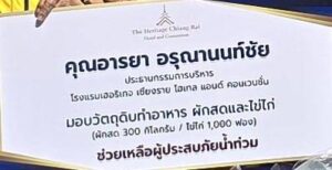 คุณอารยา อรุณานนท์ชัย ประธานกรรมการบริหาร โรงแรมเฮอริเทจ เชียงราย โฮเทล แอนด์ คอนเวนชั่น มอบวัตถุดิบทำอาหาร ผักสดและไข่ไก่ (ผักสด 300 กิโลกรัม / ไข่ไก่ 1,000 ฟอง) ช่วยเหลือผู้ประสบภัยน้ำท่วม และให้การสนับสนุนในการที่สมาคมศิริกรณ์เชียงรายบรรเทาสาธารณภัย จัดตั้งโรงครัว เพื่อประกอบอาหารเจ ให้แก่ประชาชน เพื่อมาใช้บริการได้ตลอดเทศกาลกินเจ