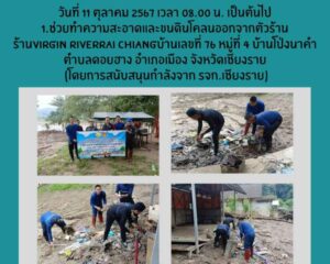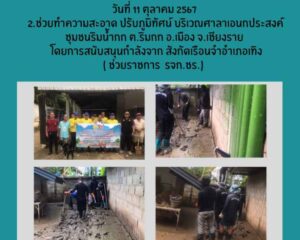 - เวลา 00 น.- 16.30 น. เจ้าหน้าที่สังกัดรจก. เชียงราย นำผู้ต้องขังจิตอาสาราชทัณฑ์ในสังกัด จำนวน 4 คน ช่วยทำความสะอาดและขนดินโคลนออกจากตัว ร้านVirgin Riverrai Chiang บ้านเลขที่ 76 หมู่ที่ 4 บ้านโป่งนาคำ ตำบลดอยฮาง อำเภอเมือง จังหวัดเชียงราย