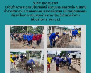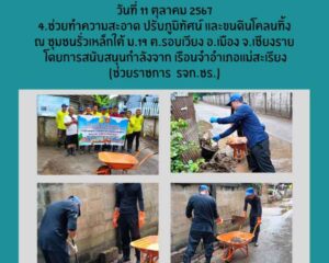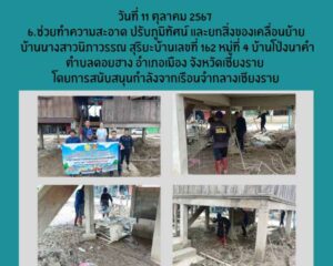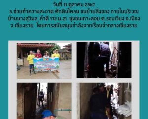 - เวลา 00 น. – 16.00 น. เจ้าหน้าที่สังกัด เรือนจำกลางเชียงราย นำผู้ต้องขังจิตอาสาราชทัณฑ์ จำนวน 5 คน ช่วยทำความสะอาด ตักดินโคลน ขนย้ายสิ่งของ ภายในบริเวณบ้านนางสุวิมล คำดี 172 ม.21 ชุมชนเกาะลอย ต.รอบเวียง อ.เมือง จ.เชียงราย