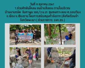 - เวลา 00 น. – 16.00 น. เจ้าหน้าที่สังกัดเรือนจำกลางเชียงราย นำผู้ต้องขังจิตอาสาจำนวน 5 คน ช่วยทำความสะอาด ปรับภูมิทัศน์ และยกสิ่งของเคลื่อนย้าย บ้านนางสาวนิภาวรรณ สุริยะบ้านเลขที่ 162 หมู่ที่ 4 บ้านโป่งนาคำ ตำบลดอยฮาง อำเภอเมือง จังหวัดเชียงราย