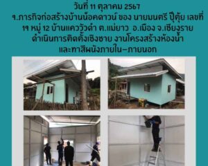 - เวลา 00 น. – 16.00 น.เจ้าหน้าที่สังกัดเรือนจำกลางเชียงราย นำผู้ต้องขังจิตอาสาราชทัณฑ์ จำนวน 5 คน ภารกิจก่อสร้างบ้านน๊อคดาว์น นายสุริยา บัวระกา บ้านเลขที่ 24 หมู่ 4 ตำบลริมกกอำเภอเมือง จังหวัดเชียงราย ดำเนินการติดตั้งหลังคา พื้นตัวบ้าน โครงผนัง