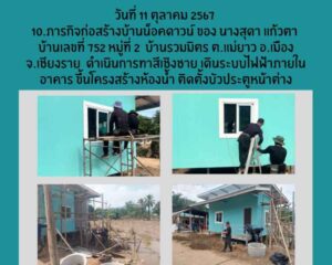 - เวลา 00 น. – 16.00 น.เจ้าหน้าที่สังกัดเรือนจำกลางเชียงราย นำผู้ต้องขังจิตอาสาราชทัณฑ์ จำนวน 5 คน ก่อสร้างบ้านน๊อคดาว์น ของ นางสุดา แก้วตา บ้านเลขที่ 752 หมู่ที่ 2 บ้านรวมมิตร ต.แม่ยาว อ.เมือง จ.เชียงราย ดำเนินการทาสีเชิงชาย เดินระบบไฟฟ้าภายในอาคาร ขึ้นโครงสร้างห้องน้ำ ติดตั้งบัวประตูหน้าต่าง