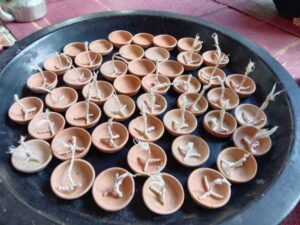 “พิธีจิหลัวไฟพระเจ้า คือ การนำเอาฟืนมาเผา เพื่อให้พระพุทธเจ้าได้ผิงไฟ การทำตีนกา เส้นฝ้ายที่ฝั้นให้เป็นเกลียว หลังจากนั้นแยกชายของเส้นฝ้ายเป็นสามแฉก เหมือนตีนกา เป็นหนึ่งในเครื่องประกอบศาสนา ฟังเทศน์ ซึ่งชาวล้านนามีความเชื่อว่า การจุดตีนกาเพื่อระลึกถึงพระคุณของแม่พระพุทธเจ้าทั้งห้าพระองค์ ตีนกาประดิษฐ์จากการอนุรักษ์ต้นฝ้ายพันธุ์พื้นเมือง การเก็บดอกฝ้าย ไปจนถึงกระบวนการสาวฝ้ายเป็นเส้นด้วยภูมิปัญญาท้องถิ่น และนำเส้นฝ้ายไปฝั้นเป็นตีนกา การจุดสีสาย เส้นฝ้ายที่เกิดจากกระบวนการปลูกฝ้ายพันธุ์พื้นเมืองในชุมชน เก็บดอกฝ้าย สาวเป็นเส้น ให้มีความยาวประมาณ 15 เซนติเมตร หลังจากนั้นนำเส้นฝ้ายไปชุบด้วยน้ำมันมะพร้าวจนชุ่ม เพื่อเป็นการสะเดาะเคราะห์ที่ไม่ดีให้พ้นจากตนเอง และการแขวนแตะดอกไม้ แตะดอกไม้ คือ เครื่องจักสานจากไม้ไผ่ สานเป็นแผ่น จำนวน 2 แผ่น หลังจากนั้นนำดอกไม้ ใบไม้พื้นเมือง บรรจุลงบนแผ่นไม้จักสาน และนำแผ่นจักสานอีกอันหนึ่งมาประกอบกัน ผูกด้วยตอกหรือเชือกให้ติดกัน และนำไปประกอบตกแต่งภายในราชวัตร (พื้นที่ประกอบพิธีเทศน์มหาชาติ) เป็นหนึ่งในเครื่องบูชาคาถาพัน