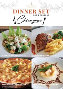 เมนู ได้แก่ ซีซาร์สลัด, สเต็กไก่, พิซซ่าต้มยำกุ้ง