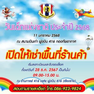 วันเด็กแห่งชาติประจำปี 2568 ฝูงบิน 416 เชียงราย เปิดให้เช่าพื้นที่ร้านค้า ตั้งแต่วันที่ 28 ธันวาคม 2567 เป็นต้นไป ข่าวทั่วไป 25 ธ.ค. 2024 681 share tweet share