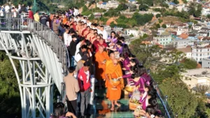 การตักบาตรลอยฟ้า บนสกายวอล์ค หนึ่งเดียวในไทย นำโดย นายสิทธิศักดิ์ อินใจคำ ปลัดอำเภอหัวหน้ากลุ่มงานบริหารงานปกครอง รักษาราชการแทนนายอำเภอแม่สายและ นายณรงค์พล คิดอ่าน อดีตนายอำเภอแม่สาย พร้อมด้วย นางยุพิน คิดอ่าน พร้อมทั้่งหัวหน้าส่วนราชการ ร่วมทำบุญ พร้อมทำพิธีสืบชะตาเมืองเชียงราย อำเภอแม่สาย ณ วัดพระธาตุดอยเวา ตำบลเวียงพางคำ อ.แม่สาย จ.เชียงราย เนื่องจากเมืองได้รับผลกระทบจากภัยพิบัติน้ำท่วมครั้งใหญ่ในรอบ 100 ปี ในเดือนกันยายน ที่ผ่านมา และทางจังหวัดเชียงรายได้สั่งการให้ทำพิธีสืบชะตาเมืองทั้งหมด 18 อำเภอ พร้อมกัน เพื่อเป็นสิรมงคล และมีชาวบ้านได้ทราบข่าว ได้ร่วมพิธีนี้เป็นจำนวนมาก