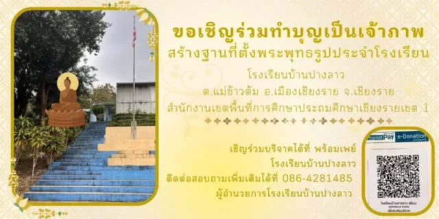 ด้วยเหตุนี้ โรงเรียนบ้านปางลาวจึงขอเชิญชวนผู้มีจิตศรัทธาทุกท่านร่วมเป็นส่วนหนึ่งในการสร้างคุณงามความดีครั้งนี้ ด้วยการบริจาคเงินเพื่อสมทบทุนการก่อสร้างฐานพระพุทธรูปหน้าเสาธง ทุกบาททุกสตางค์ที่ท่านบริจาคจะถูกนำไปใช้อย่างโปร่งใส เพื่อให้โครงการนี้สำเร็จลุล่วงและกลายเป็นสถานที่ที่สร้างแรงบันดาลใจให้กับนักเรียนและชุมชนต่อไปในอนาคต การทำบุญครั้งนี้ไม่เพียงแต่เป็นการช่วยเหลือโรงเรียน แต่ยังเป็นการสร้างบุญกุศลให้กับตัวท่านเองและครอบครัว เป็นการส่งต่อความดีงามที่ยั่งยืนไปยังรุ่นลูกรุ่นหลาน