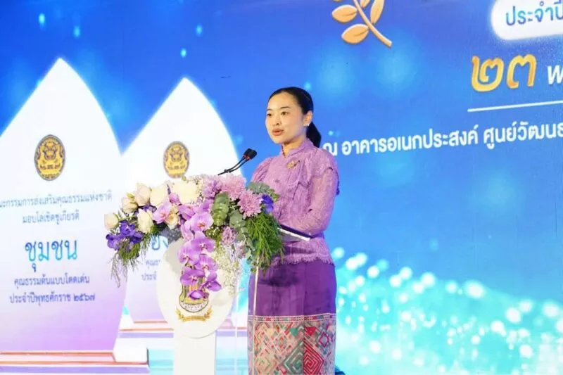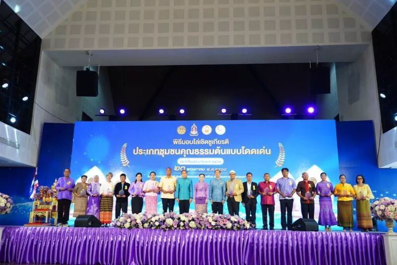 วันศุกร์ที่ 23 พฤษภาคม 2568 ณ อาคารอเนกประสงค์ ศูนย์วัฒนธรรมแห่งประเทศไทย เขตห้วยขวาง กรุงเทพมหานคร กรมการศาสนา กระทรวงวัฒนธรรม จัดพิธีมอบโล่เชิดชูเกียรติชุมชน องค์กร อำเภอ และจังหวัดคุณธรรมต้นแบบโดดเด่น ประจำปีงบประมาณ พ.ศ. 2567 โดยมี นางสาวสุดาวรรณ หวังศุภกิจโกศล รัฐมนตรีว่าการกระทรวงวัฒนธรรม รองประธานกรรมการส่งเสริมคุณธรรมแห่งชาติ เป็นประธานในงานพิธีมอบโล่เชิดชูเกียรติฯ พร้อมด้วย นายประสพ เรียงเงิน ปลัดกระทรวงวัฒนธรรม นายชัยพล สุขเอี่ยม อธิบดีกรมการศาสนา ผู้บริหารกระทรวงวัฒนธรรม และผู้แทนจากชุมชน องค์กร อำเภอ และจังหวัด เข้าร่วมพิธีดังกล่าว ณ อาคารอเนกประสงค์ ศูนย์วัฒนธรรมแห่งประเทศไทย เขตห้วยขวาง กรุงเทพมหานคร