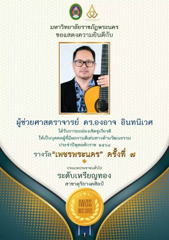 ๓. ผช.ดร.องอาจ อินทนิเวศ คณะมนุษยศาสตร์ มหาวิทยาลัยราชภัฏเชียงราย รางวัล “เพชรพระนคร” ระดับเหรียญทอง สาขาดุริยางคศิลป์
