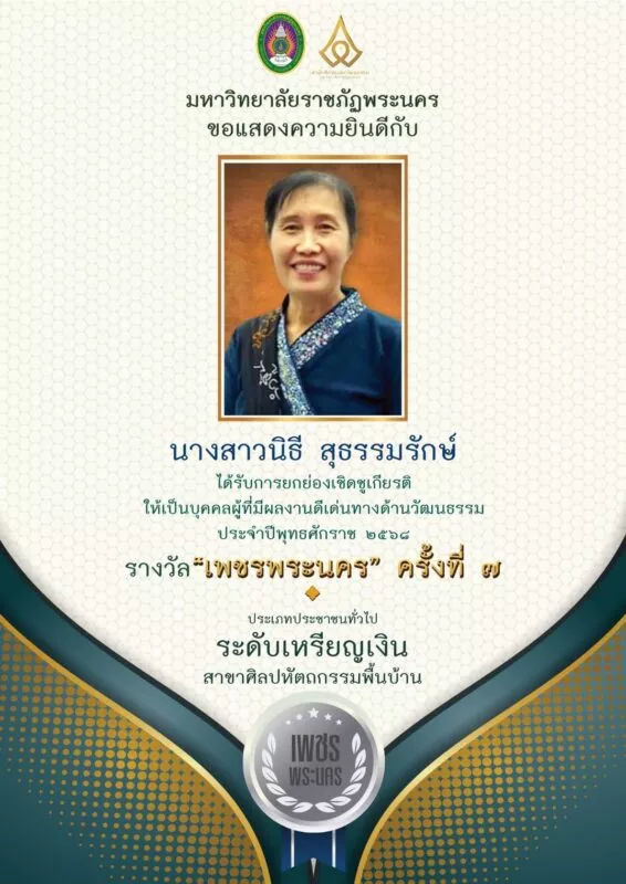 ๔. แม่ครูนิธี สุธรรมรักษ์ ศูนย์เรียนรู้ผ้าปักมือบ้านสันกอง ต.แม่ไร่ อ.แม่จัน รางวัล “เพชรพระนคร” ระดับเหรียญเงิน สาขางานศิลปหัตถกรรมพื้นบ้าน