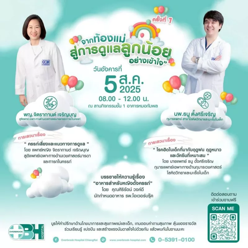 วันที่ 5 สิงหาคม 2568 โรงพยาบาลโอเวอร์บรุ๊ค จัดกิจกรรมให้ความรู้ ภายใต้หัวข้อ “จากท้องแม่ สู่การดูแลลูกน้อยอย่างเข้าใจ” ครั้งที่ 1 เพื่อเสริมสร้างความรู้ ความเข้าใจ และการเตรียมความพร้อมทั้งด้านร่างกายและจิตใจ สำหรับคุณแม่ตั้งครรภ์และครอบครัว โดย นพ.ณัฐชัย เครือจักร รักษาการผู้อำนวยการ และรักษาการผู้จัดการโรงพยาบาล เป็นประธานกล่าวเปิดงาน พร้อมกล่าวต้อนรับผู้เข้าร่วมกิจกรรมอย่างอบอุ่น