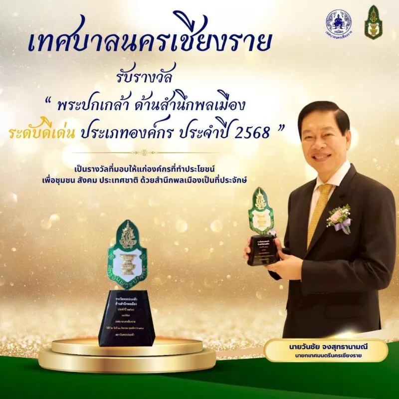 ในโอกาสสำคัญ นายวันชัย จงสุทธานามณี นายกเทศมนตรีนครเชียงราย เข้ารับโล่รางวัลพระปกเกล้า ด้านสำนึกพลเมือง “ประเภทองค์กร” จาก รศ.ดร.อิสระ เสรีวัฒนวุฒิการ เลขาธิการสถาบันพระปกเกล้า