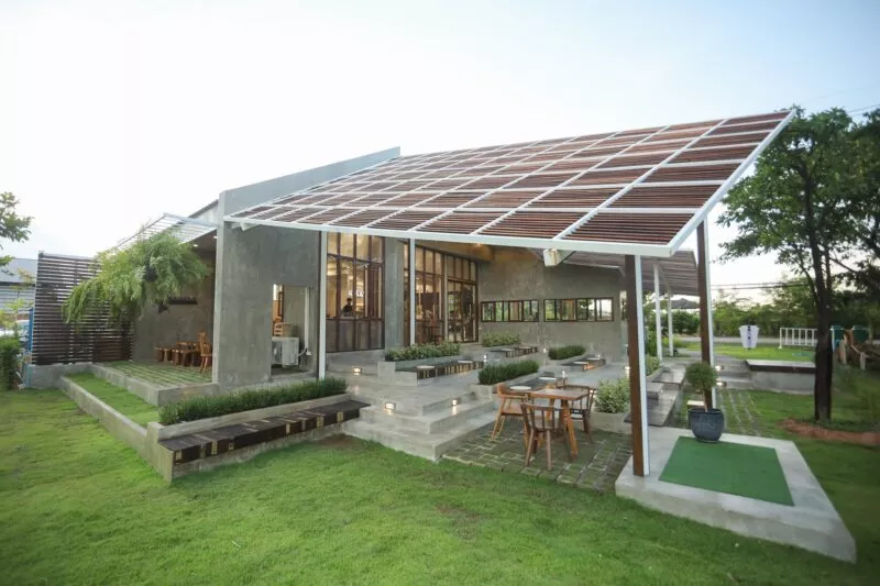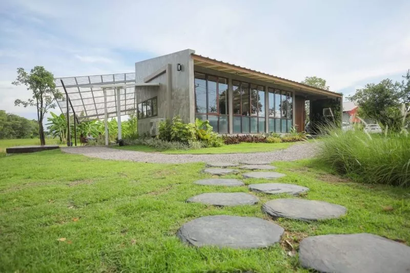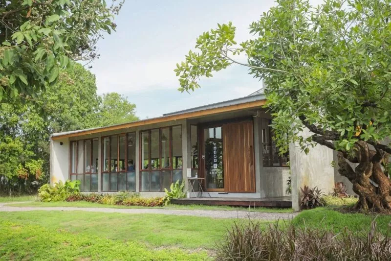 สำหรับคาเฟ่ที่โอบล้อมด้วยสีเขียวของทุ่งนาและสวนกล้วยแห่งนี้ ก่อนจะถูกแปลงโฉมโดยเจ้าของร้านซึ่งเป็นสถาปนิกหนุ่มชาวเชียงราย ที่มีแรงบันดาลใจอยากสร้างพื้นที่ที่ผสมความเรียบง่ายกับความตั้งใจในทุกดีเทล จึงออกแบบสถาปัตยกรรมสไตล์ Minimal Urban ผสม Loft ให้ตัวอาคารปูนเปลือยสีอ่อนขัดมันดูสะอาดตา ตัดกับเฟอร์นิเจอร์ไม้โทนอบอุ่นที่ชวนให้นั่งได้นานโดยไม่รู้สึกแข็งกระด้าง เพดานภายในเล่นระดับต่อเนื่องกับขั้นบันไดด้านนอก ทำให้เกิดมิติและความเชื่อมโยงระหว่างพื้นที่ในร้านกับสวนด้านนอก กระจกบานใหญ่รอบด้านเปิดรับแสงและวิวธรรมชาติเต็มสายตา นั่งแล้วสบายตาไม่อึดอัดแม้ในวันที่แดดแรง ด้านหลังร้านมีสวนเล็ก ๆ ร่มรื่นจัดไว้อย่างพอดี เหมาะทั้งกับการพักสายตาและถ่ายรูปแบบไม่ต้องจัดท่ามาก