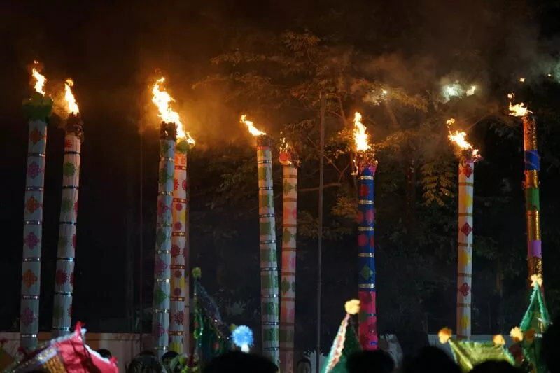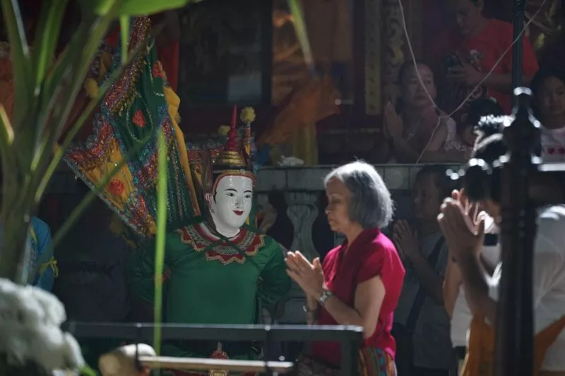 อีกหนึ่งพิธีกรรมสำคัญในงาน คือ การจุดต้นเกี๊ยะ (คบไฟสน) จุดไฟเพื่อบูชาพระพุทธเจ้า เป็นสัญลักษณ์แห่งการ บูชารัตนตรัย สะท้อนถึง ความศรัทธา ความสว่างไสว และการละสิ้นทุกข์โศก