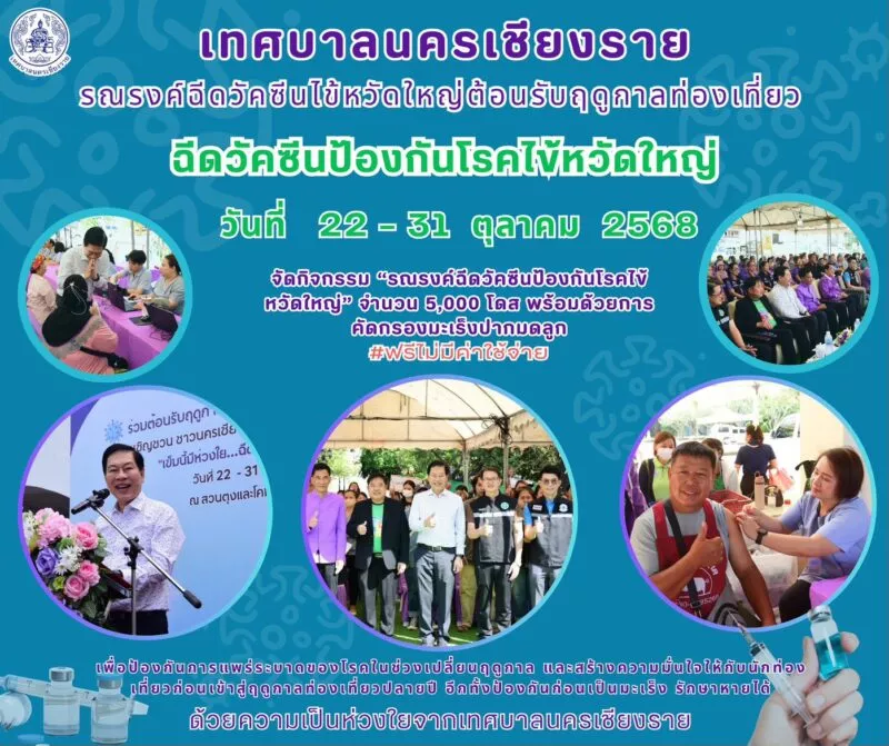 จัดกิจกรรม “รณรงค์ฉีดวัคซีนป้องกันโรคไข้หวัดใหญ่” จำนวน 5,000 โดส พร้อมด้วยการคัดกรองมะเร็งปากมดลูก ฟรีไม่มีค่าใช้จ่าย ในเขตเทศบาลนครเชียงราย เพื่อป้องกันการแพร่ระบาดของโรคในช่วงเปลี่ยนฤดูกาล และสร้างความมั่นใจให้กับนักท่องเที่ยวก่อนเข้าสู่ฤดูกาลท่องเที่ยวปลายปี อีกทั้งป้องกันก่อนเป็นมะเร็ง รักษาหายได้