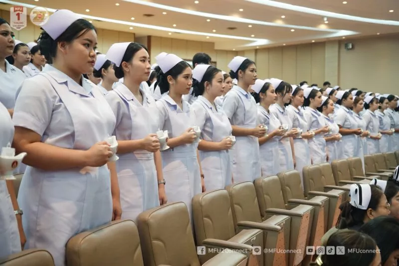 เมื่อวันศุกร์ที่ 17 ตุลาคม 2568 มหาวิทยาลัยแม่ฟ้าหลวง (มฟล.) โดย สำนักวิชาพยาบาลศาสตร์ จัดพิธีมอบหมวก ดวงประทีป และเข็มชั้นปี แก่นักศึกษาพยาบาลศาสตร์ ชั้นปีที่ 3 ประจำปีการศึกษา 2568 จำนวน 139 คน ณ หอประชุมสมเด็จย่า และร่วมพิธีกล่าวคำปฏิญาณต่อพระราชานุสาวรีย์สมเด็จพระศรีนครินทราบรมราชชนนี ในการนี้ รศ. ดร.ดรุณี วัฒนศิริเวช รองอธิการบดี มฟล. ร่วมกล่าวแสดงความยินดีและมอบโอวาทแก่นักศึกษา จากนั้นเข้าสู่ช่วงพิธีการ โดยมี ผู้ช่วยศาสตราจารย์ ดร.ชมพูนุช โสภาจารีย์ คณบดีสำนักวิชาพยาบาลศาสตร์ เป็นประธานในพิธีและกล่าวปัจฉิมโอวาท อาจารย์ ดร.พิมพ์รัตน์ บุณยะภักดิ์ รองคณบดี กล่าวรายงาน พร้อมด้วยคณาจารย์ เจ้าหน้าที่ นักศึกษาพยาบาล แขกผู้มีเกียรติ และครอบครัวผู้เข้าร่วมพิธี ร่วมแสดงความยินดี