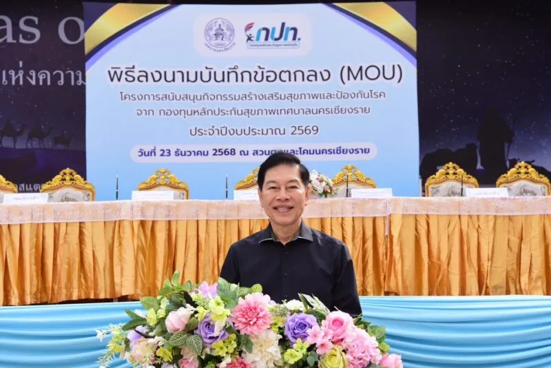 วันที่ 23 ธันวาคม 2568 เทศบาลนครเชียงรายจัดพิธีลงนามบันทึกข้อตกลง (MOU) โครงการสนับสนุนกิจกรรมสร้างเสริมสุขภาพและป้องกันโรค จากกองทุนหลักประกันสุขภาพเทศบาลนครเชียงราย ณ สวนตุงและโคมนครเชียงราย
