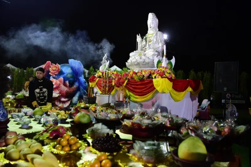 ในโอกาสอันเป็นสิริมงคลนี้ ได้รับความเมตตาจาก พระไพศาลประชาทร วิ (หลวงพ่อพบโชค) เจ้าอาวาส วัดห้วยปลากั้ง อัญเชิญพระโพธิสัตว์กวนอิมมาประดิษฐาน เพื่อนำพุทธศาสนิกชนและพี่น้องประชาชนร่วมประกอบพิธีสักการะ เสริมสร้างสิริมงคล ความสุข และความเจริญรุ่งเรืองแก่ตนเองและครอบครัวสืบสานวัฒนธรรมประเพณีอันดีงามของพี่น้องชาวไทยเชื้อสายจีนให้คงอยู่คู่เมืองเชียงราย