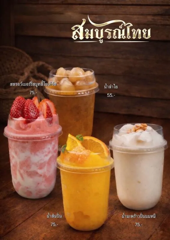 ด้านเครื่องดื่มและของหวาน สมบูรณ์ไทย ก็จัดเต็มไม่แพ้กันครับ มีเมนูน้ำผลไม้ปั่นสดๆ อย่างน้ำส้ม น้ำมะพร้าวปั่นนมหมี หรือสมูทตี้โยเกิร์ตที่ช่วยเติมความสดชื่นได้เป็นอย่างดี และที่ถือเป็น “Signatur” ปิดท้ายมื้ออาหารคือ ไอศกรีมกะทิมะพร้าวอ่อนโฮมเมด และ ข้าวเหนียวมะม่วง ที่จัดจานมาอย่างประณีตในเรือแก้วสวยงาม รสชาติหวานมันกำลังดี หอมกลิ่นกะทิแท้ๆ เป็นการปิดจบมื้ออาหารที่สมบูรณ์แบบตามชื่อร้านจริงๆ ครับ
