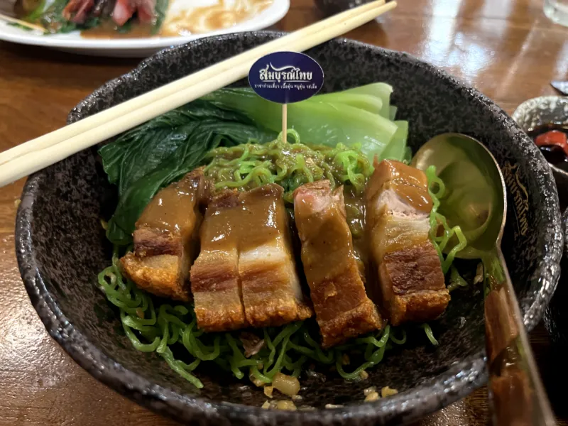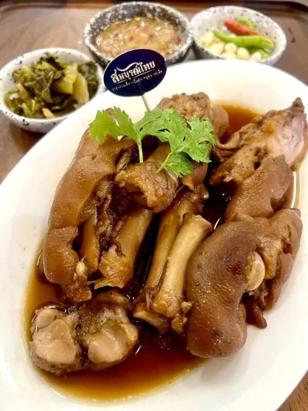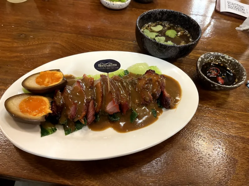 ในส่วนของเมนูอาหาร ถือเป็นไฮไลต์สำคัญที่ทำให้ใครต่อใครต้องแวะเวียนมาซ้ำ เพราะที่นี่ขึ้นชื่อว่าเป็น “ราชาแห่งเนื้อตุ๋น หมูตุ๋น” เมนูเด็ดที่ห้ามพลาดเลยคือ เกาเหลาหม้อไฟ ที่น้ำซุปมีความเข้มข้น หอมกลิ่นเครื่องเทศสมุนไพรเคี่ยวจนเข้าเนื้อ รสชาติกลมกล่อมแทบไม่ต้องปรุงเพิ่ม สายเนื้อต้องลอง ลิ้นวัวกระทะร้อน ที่เสิร์ฟมาพร้อมเสียงซู่ซ่าและกลิ่นหอมของกระเทียมเจียว เนื้อลิ้นมีความนุ่มเด้งเป็นเอกลักษณ์ นอกจากนี้ยังมีเมนู บะหมี่ไข่ฮ่องกง เส้นแบนเหนียวนุ่ม ทานคู่กับหมูกรอบหนังฟูสะท้านใจ หรือขาหมูสมบูรณ์ไทยที่ตุ๋นจนเปื่อยละลายในปาก เป็นเมนูที่ทานง่ายแต่รสชาติระดับมืออาชีพจริงๆ ครับ