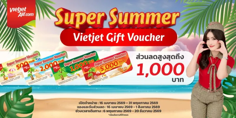 โปรโมชัน Super Summer Vietjet Gift Voucher เปิดจำหน่ายตั้งแต่วันที่ 16 เมษายน – 31 พฤษภาคม 2569 โดยสามารถใช้จองและรับส่วนลดได้ตั้งแต่วันที่ 16 เมษายน – 1 สิงหาคม 2569 และเดินทางได้ตั้งแต่วันที่ 6 พฤษภาคม – 20 ธันวาคม 2569 สิทธิพิเศษมีจำนวนจำกัด ผู้ที่สนใจสามารถเลือกซื้อบัตรกำนัล และศึกษารายละเอียดเพิ่มเติมได้ทางเว็บไซต์ www.vietjetair.com และแอปพลิเคชัน Vietjet Thailand