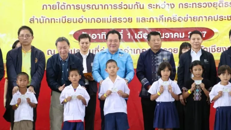 พ.ต.อ.ทวี สอดส่อง รัฐมนตรีว่าการกระทรวงยุติธรรม เข้าร่วมพิธีมอบบัตรประจำตัว บุคคลไม่มีสถานะทางทะเบียน และกลุ่มเด็กนักเรียนที่มีเลขประจำตัวขึ้นต้นด้วยอักษร G ตามนโยบายนำความยุติธรรมเข้าหาประชาชน ณ หอประชุมที่ว่าการอำเภอแม่สรวย จังหวัดเชียงราย