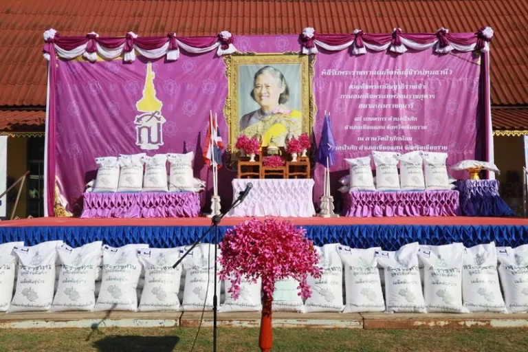 สมเด็จพระกนิษฐาธิราชเจ้า กรมสมเด็จพระเทพรัตนราชสุดาฯ สยามบรมราชกุมารี พระราชทานเมล็ดพันธุ์ข้าวปทุมธานี 1 ของมูลนิธิชัยพัฒนา แก่เกษตรกรผู้ประสบปัญหาภัยแล้งที่อำเภอเชียงแสน จังหวัดเชียงราย