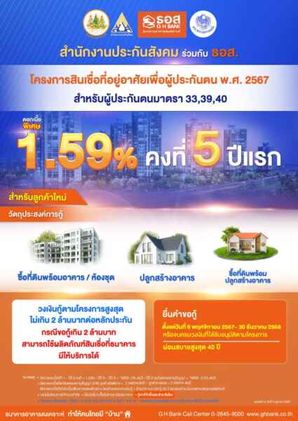 ธอส. ร่วมกับ สำนักงานประกันสังคม ลงนาม MOU โครงการสินเชื่อที่อยู่อาศัยเพื่อผู้ประกันตน พ.ศ. 2567 ปล่อยสินเชื่ออัตราดอกเบี้ย 5 ปีแรก เพียง 1.59% ต่อปี ช่วยเหลือผู้ประกันตนมีบ้านเป็นของตนเอง
