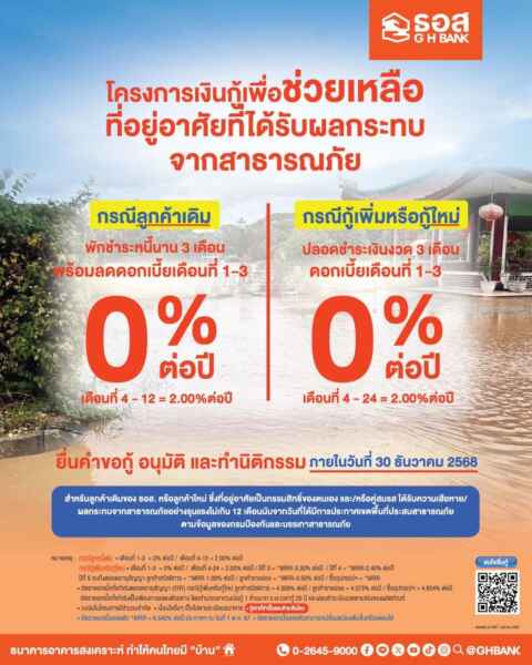 โครงการเงินกู้เพื่อช่วยเหลือที่อยู่อาศัยที่ได้รับผลกระทบจากสาธารณภัย สำหรับลูกค้าปัจจุบัน และลูกค้าใหม่ พักชำระหนี้นาน 3 เดือน พร้อมลดอัตราดอกเบี้ยเงินกู้เหลือ 0% ต่อปี 3 เดือนแรก