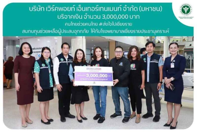 บริษัท เวิร์คพอยท์ เอ็นเทอร์เทนเมนท์ จำกัด (มหาชน) ช่อง 23 มอบเงินบริจาค จำนวน 3,000,000 บาท “คนไทยช่วยคนไทย ส่งใจไปเชียงราย”