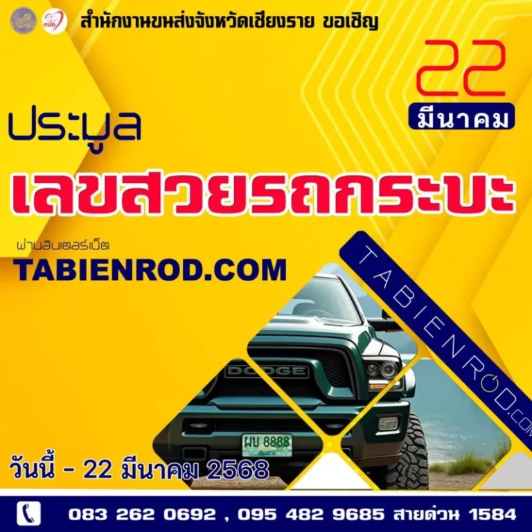 สำนักงานขนส่งจังหวัดเชียงราย ขอเชิญประมูลหมายเลขทะเบียนรถ ซึ่งเป็นที่ต้องการหรือเป็นที่นิยมของประชาชนหรือทะเบียนรถสวย ประเภทรถยนต์บรรทุกส่วนบุคคล