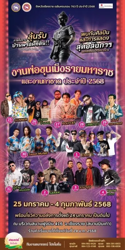 งานพ่อขุนเม็งรายมหาราชและงานกาชาดจังหวัดเชียงราย 2568 ณ บริเวณสนามบินเก่า ฝูงบิน 416 เชียงราย ในวันที่ 25 มกราคม – 4 กุมภาพันธ์ 2568
