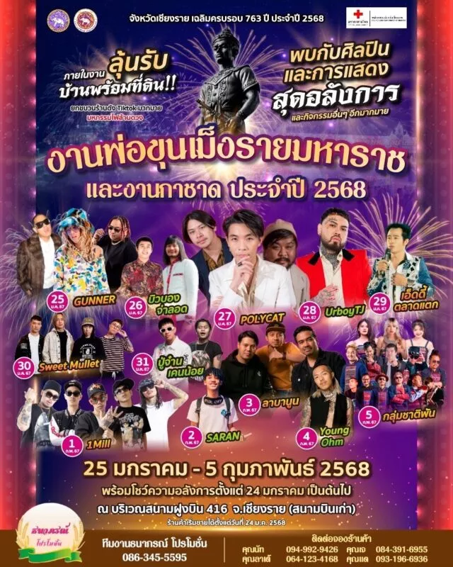 งานพ่อขุนเม็งรายมหาราชและงานกาชาดจังหวัดเชียงราย 2568 ณ ลานสนามบินเก่า ฝูงบิน 416 อ.เมืองเชียงราย 25 มกราคม – 5 กุมภาพันธ์ 2568