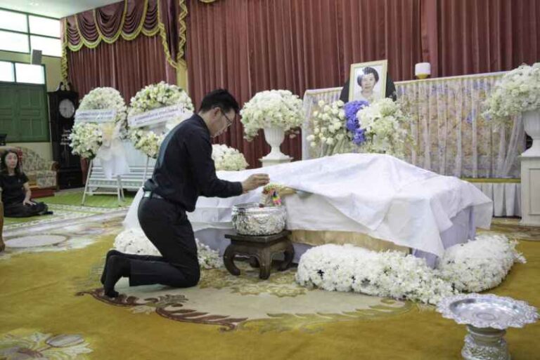 โชติศิริ ดารายน นายกสมาคมสื่อมวลชนและนักประชาสัมพันธ์เชียงราย ร่วมในพิธีรดน้ำศพ นางทองศรี ละอองนวลพานิช อายุ 90 ปี