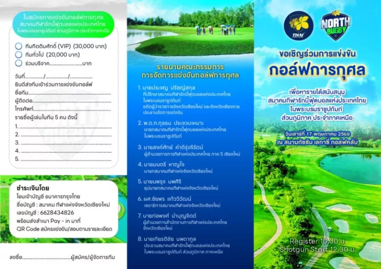 ขอเชิญร่วมการแข่งขันกอล์ฟการกุศล เพื่อหารายได้สนับสนุนกิจกรรมสมาคมรักบี้ฯภาคเหนือ