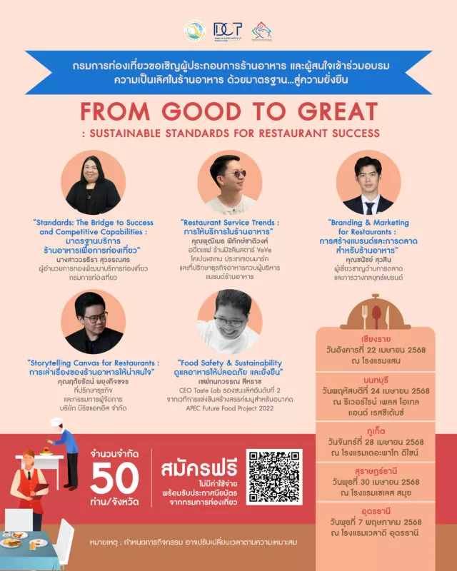 กรมการท่องเที่ยวได้ดำเนินกิจกรรมการพัฒนาศักยภาพผู้ประกอบการด้านบริการเพื่อการท่องเที่ยวภายใต้โครงการส่งเสริมและพัฒนาศักยภาพผู้ประกอบการเพื่อเข้าสู่มาตรฐาน ประจำปีงบประมาณ พ.ศ. ๒๕๖๘